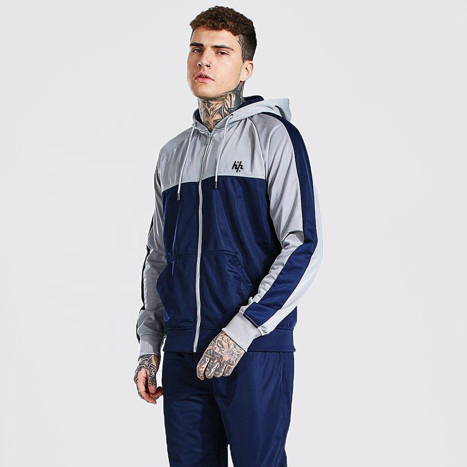 Men Custom New Fashion Wholesale Navy Poly Colour Block Zip Hooded Tracksuit Skinny Tracksuit Men Slim Fit Male Sweatsuit