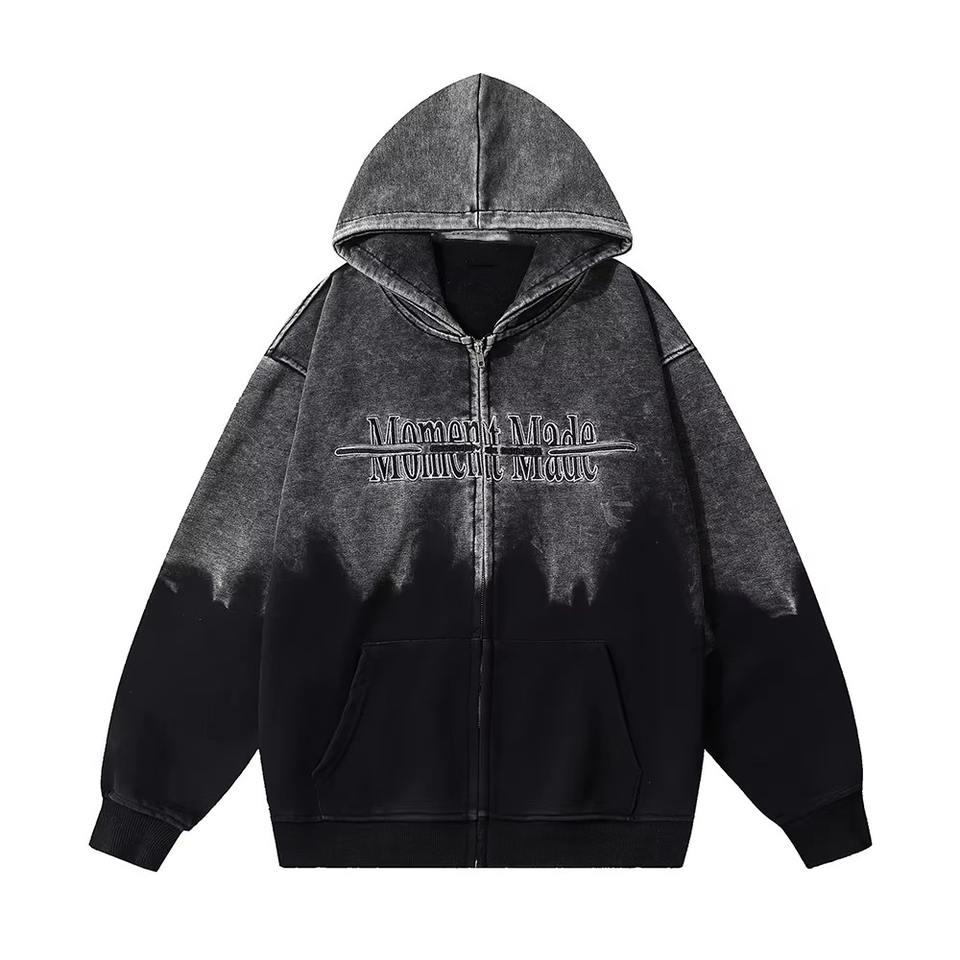 Men Dip-Dye Zip Hoodie Gothic Streetwear Sweatshirt with Moment Made Embroidery and Washed Black Finish