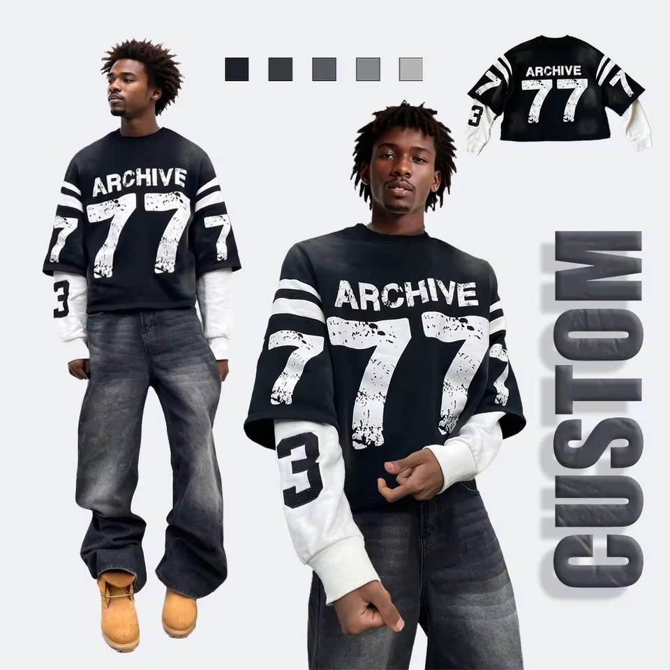 Men Double Layered Long Sleeve Acid Wash Vintage Drop Shoulder 300 Gsm Heavy Cotton Hip Hop Crewneck Cropped Print Tshirt