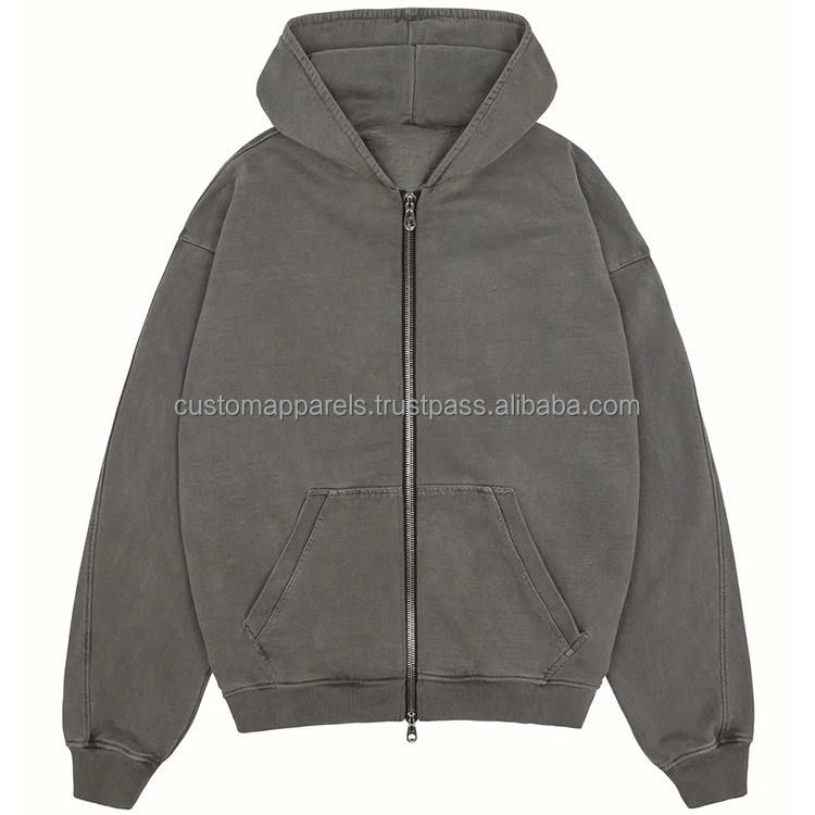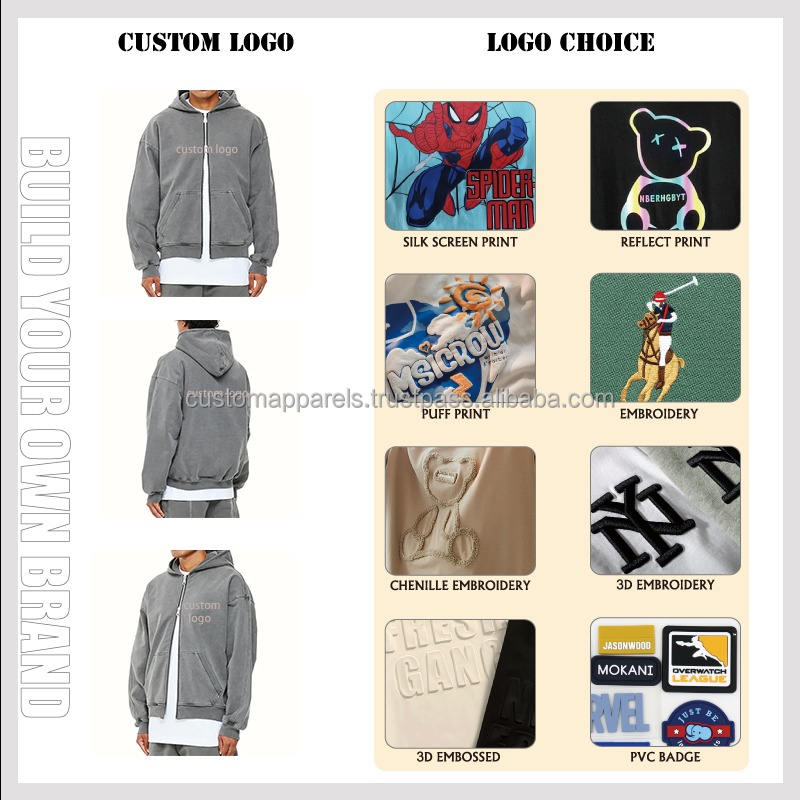 Men Full Zip up Hoodie Custom Logo Cotton French Terry Puff Print High Quality Heavyweight Vintage Acid Wash Zip up Hoodie