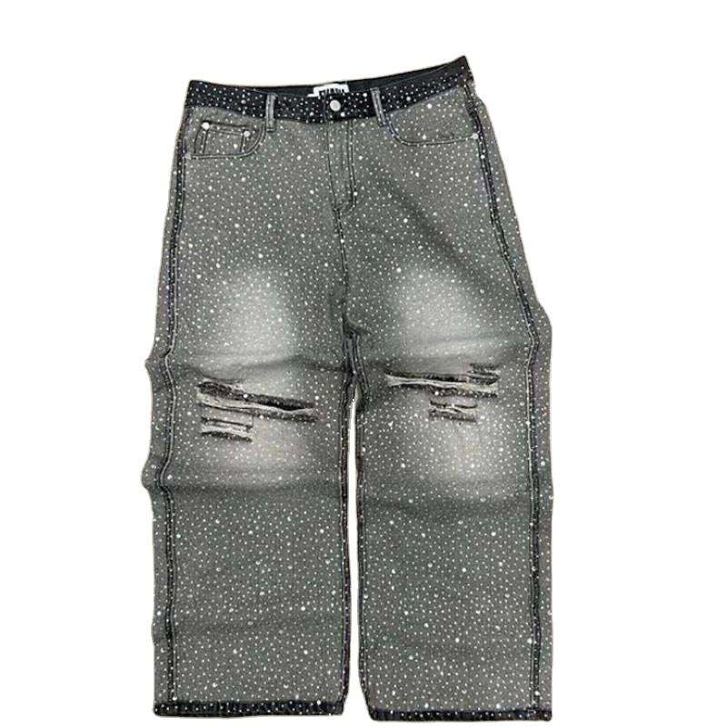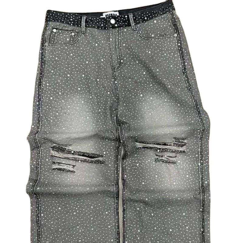 Men Grey Rhinestone Baggy Jeans Distressed Ripped Knee Loose Fit Streetwear Denim Pants For Men