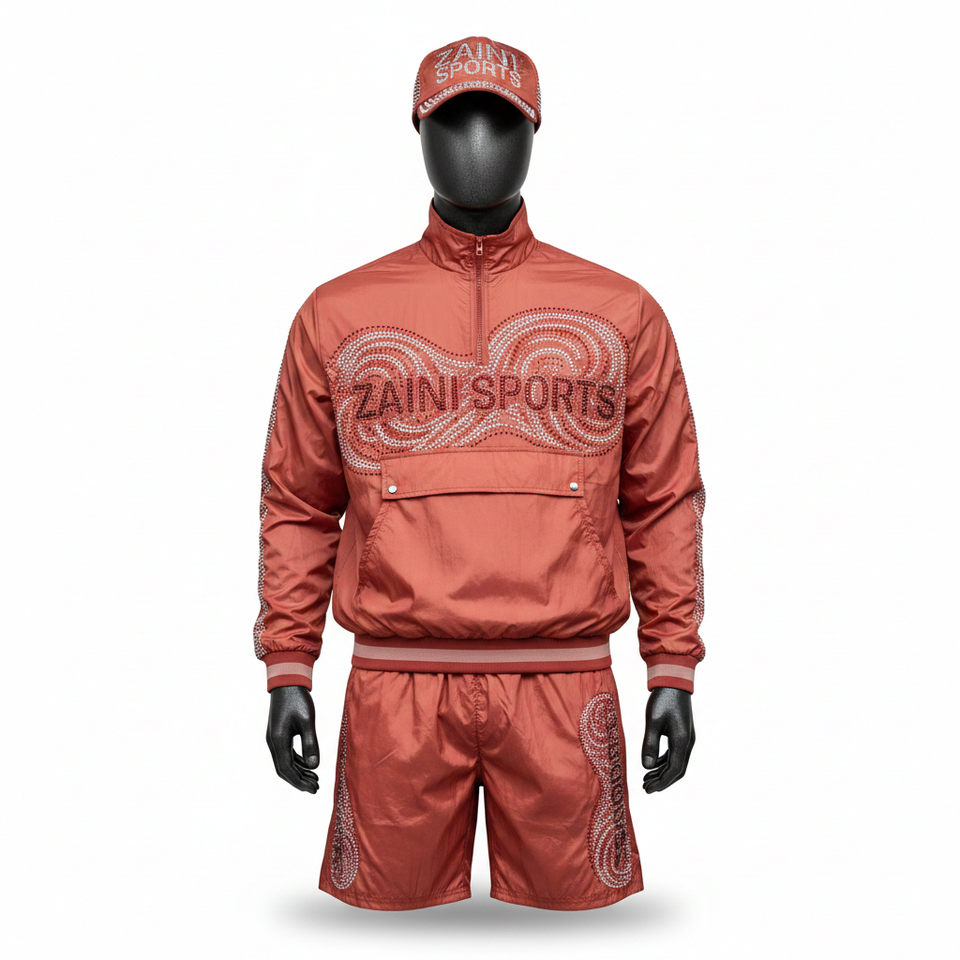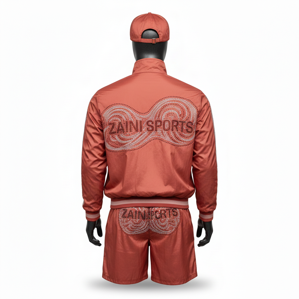 Men High Quality Nylon Windbreaker Short Set Smooth Wind Resistant Fabric Contrast Side Panels Heat Transfer Logo plus size