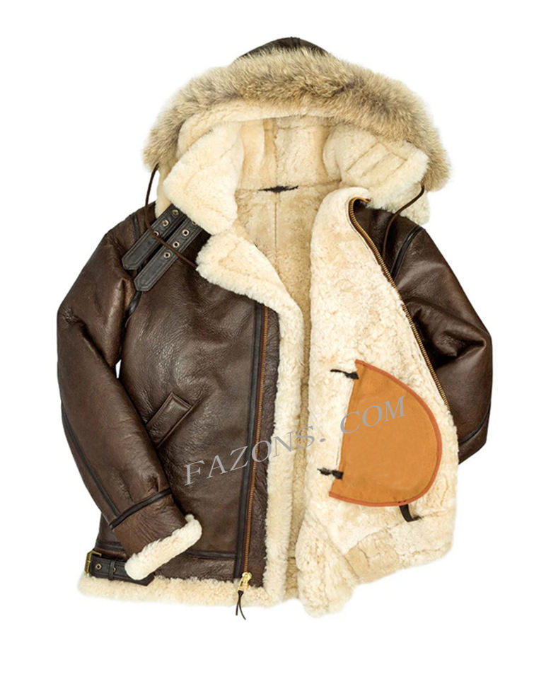Men Hooded Casual Shearling Flying Sherpa Bomber Aviator Leather Jacket Raccoon Fur Trim Dispacthed Hood B3 Sheepskin Jacket OEM