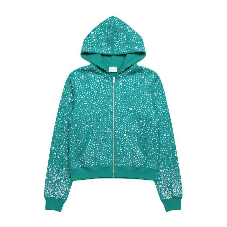Men Hoodies 500gsm Cotton Rhinestone Men Cropped Zipper Hoodies Custom Printed Oversized Acid Wash Distressed Zip up Hoodie