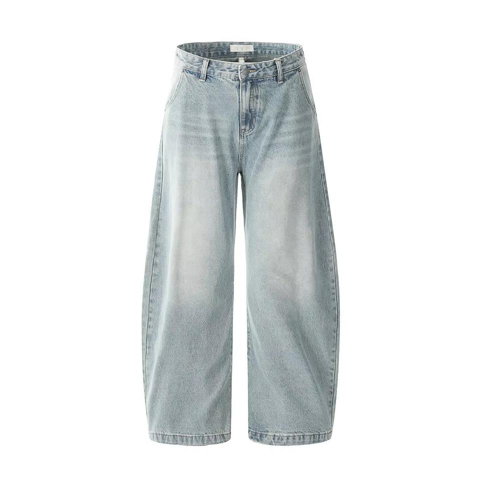 Men Light Blue Wash Denim Jeans American Retro Baggy Wide Leg Jeans Pants High Quality Punk Style Cargo Jeans