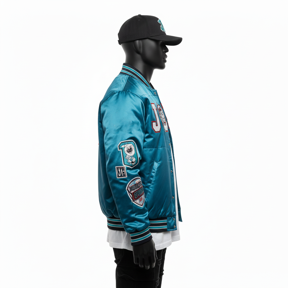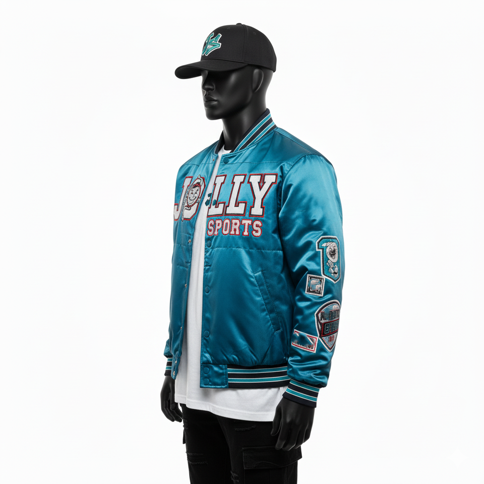 Men Luxury Satin Jacket 180 GSM Soft Polyester Satin Teal Green Varsity Look With Custom Chenille Logo Satin Jacket for man