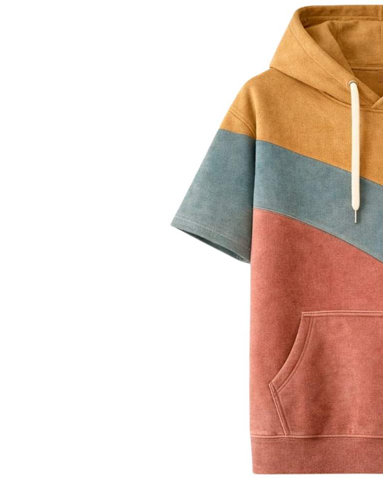 Men Mustard Teal Rust Color Block Short Sleeve Hoodie Pullover Cotton Fleece Casual Streetwear Kangaroo Pocket Sweatshirt