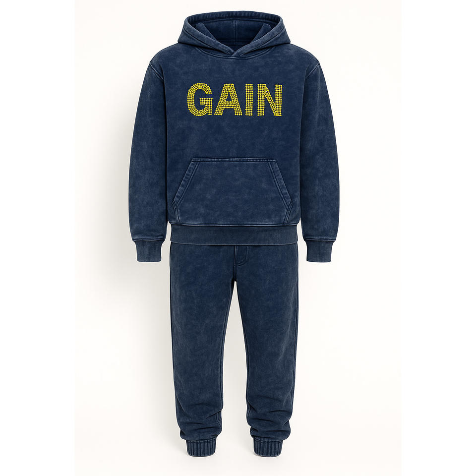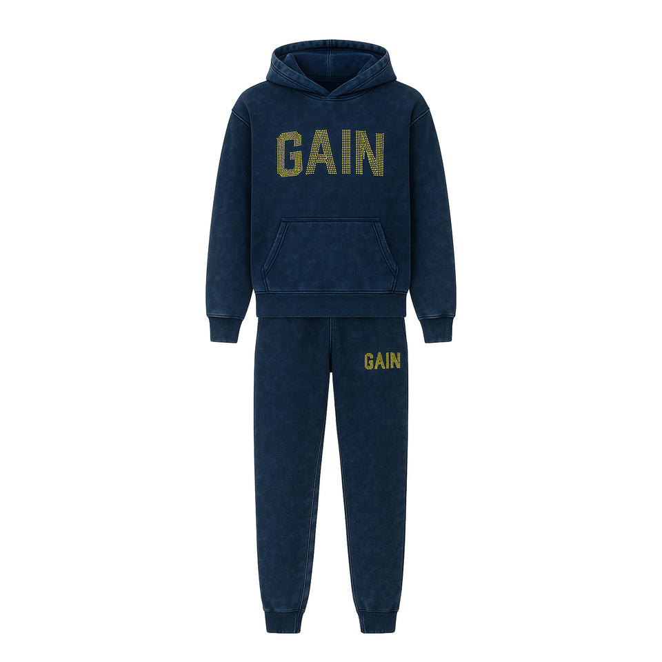 Men Navy Blue Acid Wash Tracksuit with Rhinestone Logo Hoodie and Sweatpants Set Acid Washed Set For Both Men And Women