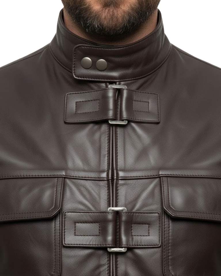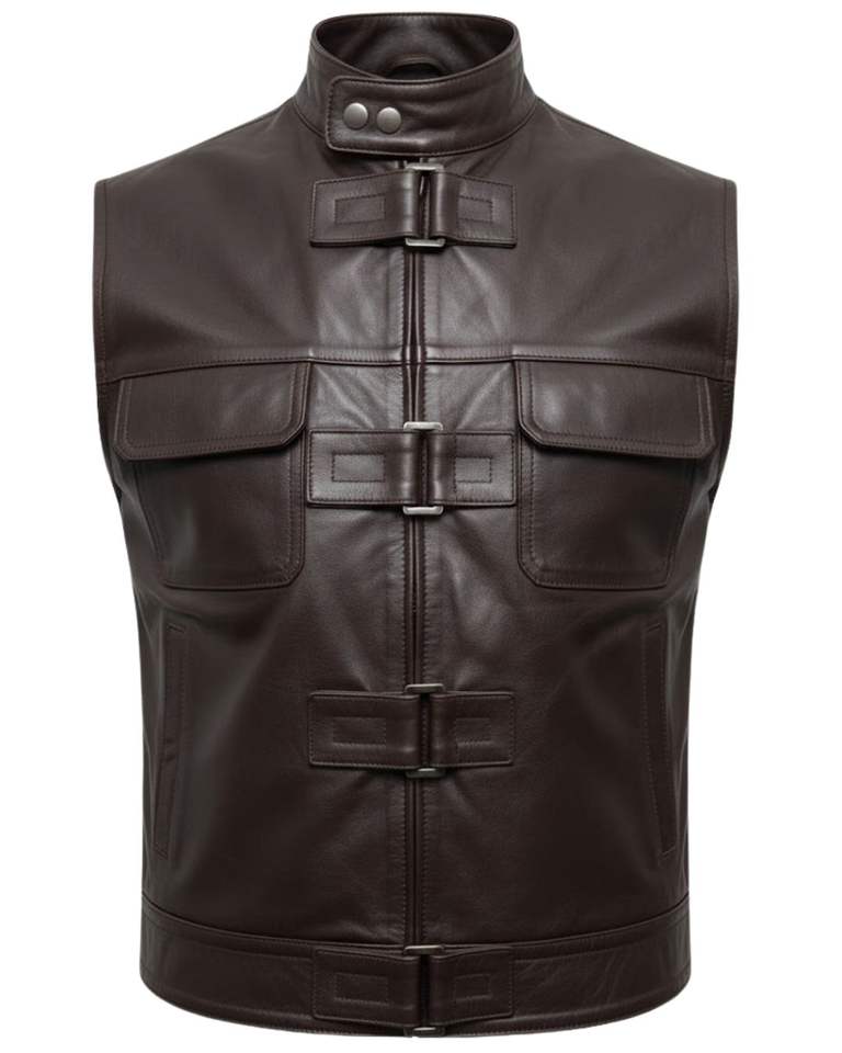 Men Premium Black Genuine Leather Biker Vest Sleeveless High Collar Sleeveless Waistcoat with Front Zip and Strap Closure
