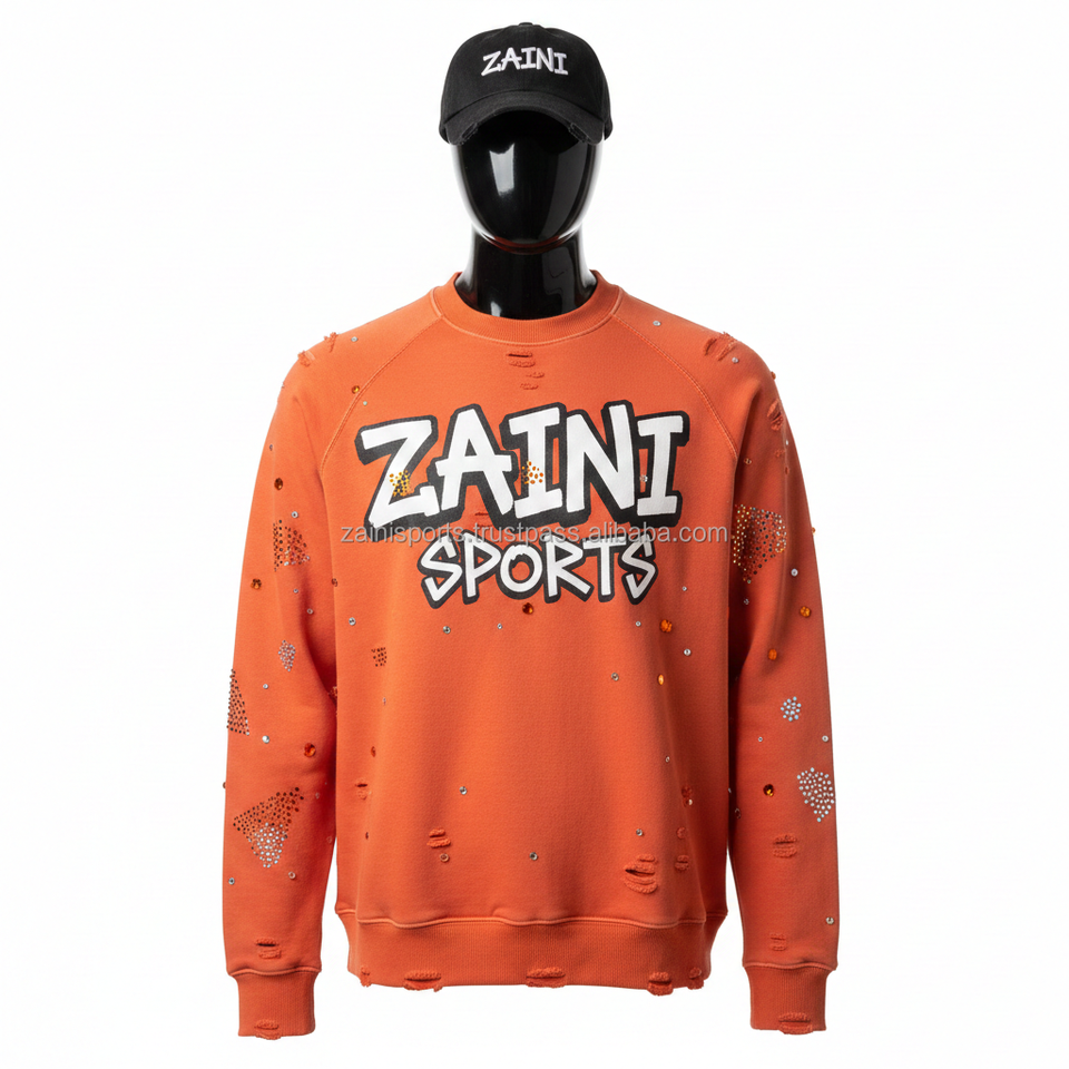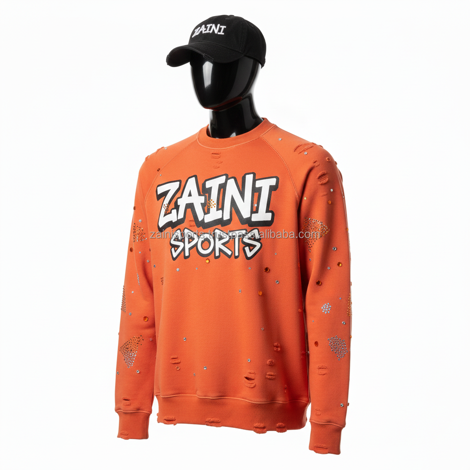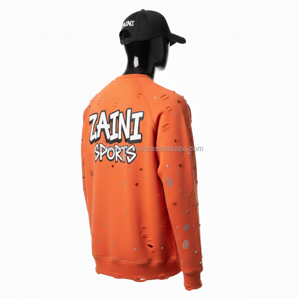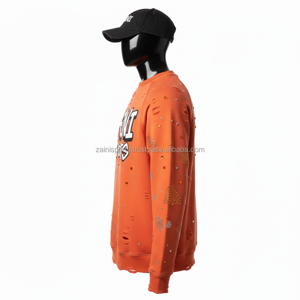 Men Pullover Sweatshirt Soft Cotton Fleece Distressed Style Orange Color With Customized Embroidery Logo Basics Sweatshirts