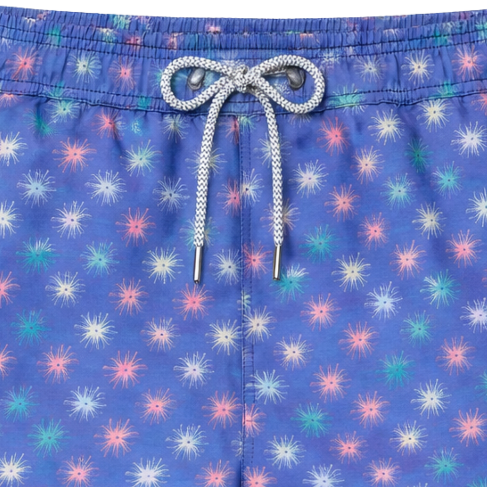 Men Recycled Swim Shorts Multicolor Starfish Print Quick Dry Beach Swim Trunks with Elastic Waist Drawstring Pockets