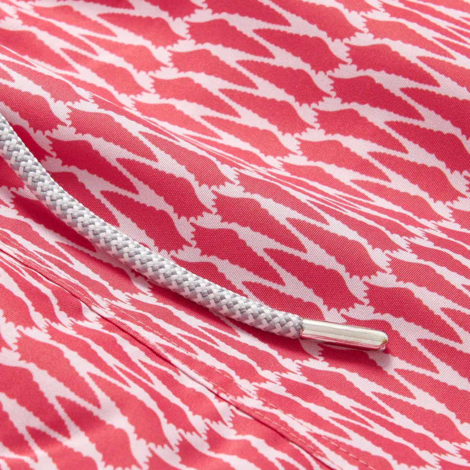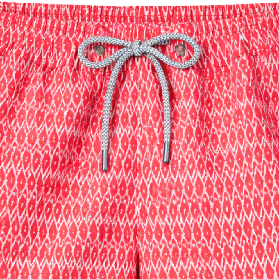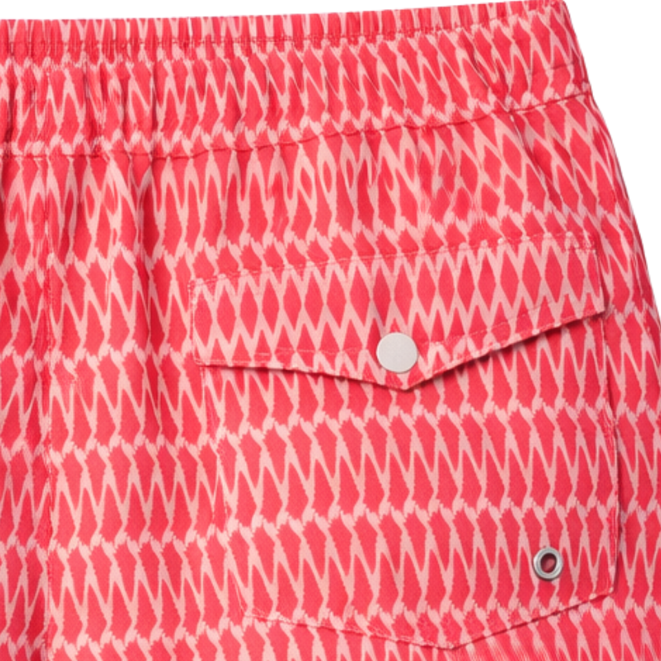 Men Recycled Swim Shorts Red Geometric Shell Pattern Quick Dry Beach Swim Trunks with Elastic Waist Drawstring Pockets