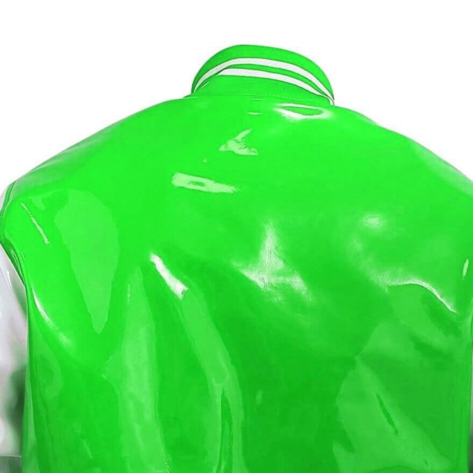 Unisex Retro PVC Leather Letterman Baseball Bomber Varsity Jacket with Stand Collar and Front Logo
