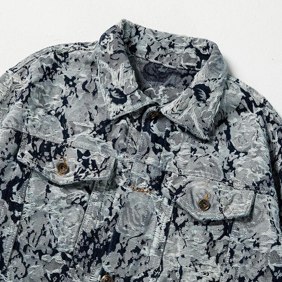 Men Ripped Distressed Denim Jacket Flower Jacquard Weave Embroidery Coat Loose Long Sleeve Outerwear Lightweight Coat for Men's