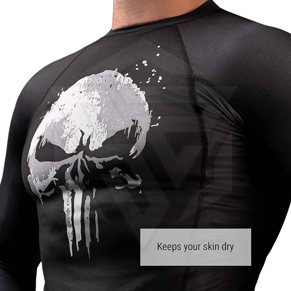 Men Skull Graphic Compression MMA Rash Guard Long Sleeve Gym Fitness Workout Breathable Quick Dry Athletic Sports Top Tanzainra