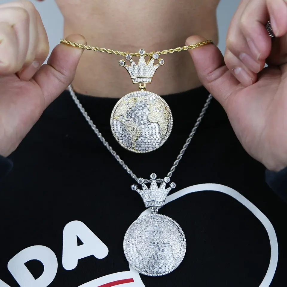 Men Sterling Silver World Map Pendant Full Paved Round CZ Link Chain Hip Hop Fashion Party Jewelry Gift World Mine Bling