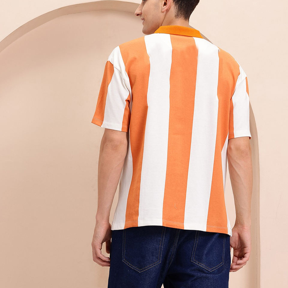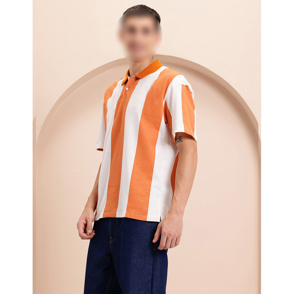 Men Striped Polo Collar Relaxed Fit T-Shirt Short Sleeve In Orange And White Color Contrast Casual Oversized Straps Polo Shirts
