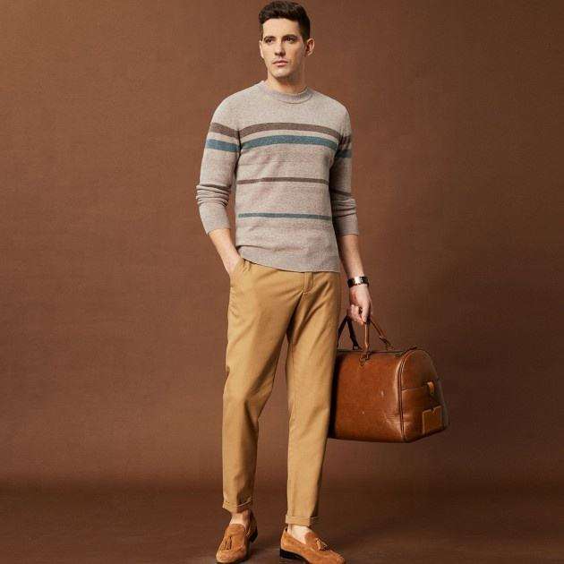 Men Striped Round Neck Winter Sweater Soft Wool Blend Classic Casual Warm Pullover