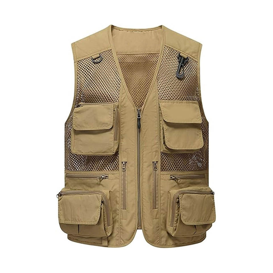 Men Autumn Woolen Cargo Vest Plaid Casual Multi-Pocket Outdoor Sports V-Neck Loose Breathable Thin Waistcoat Customizable Cotton