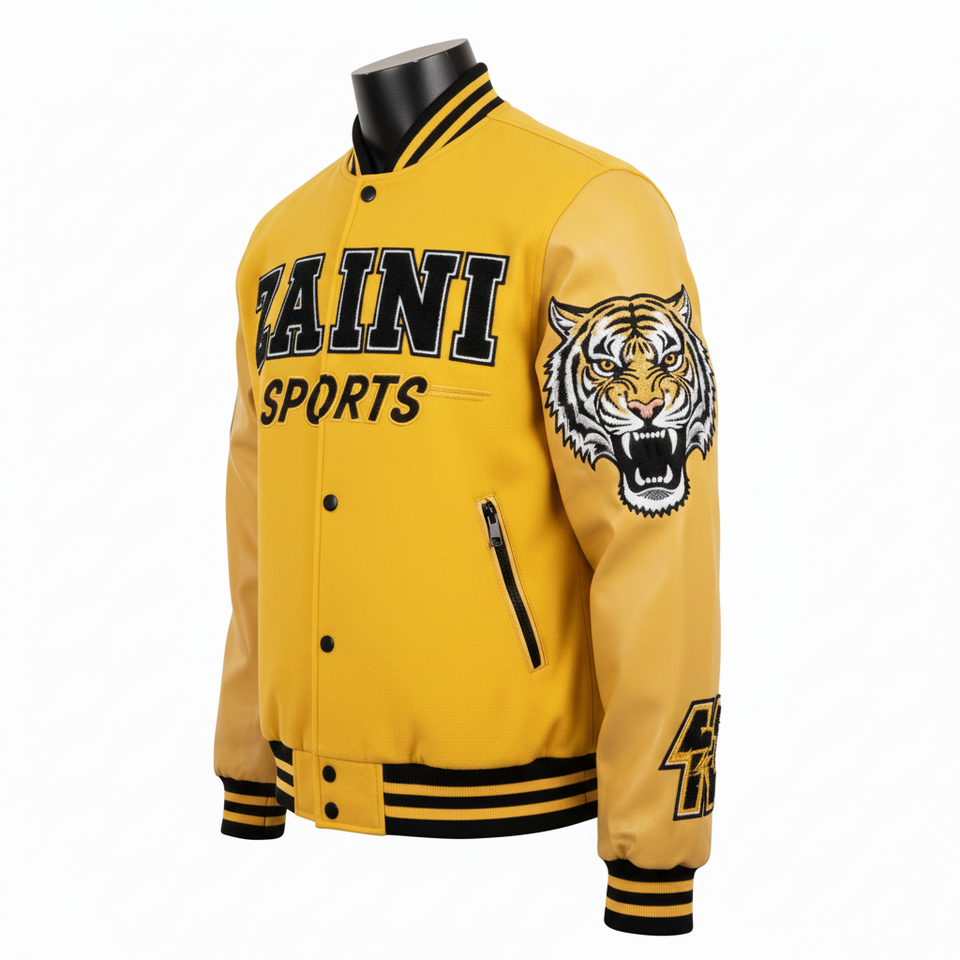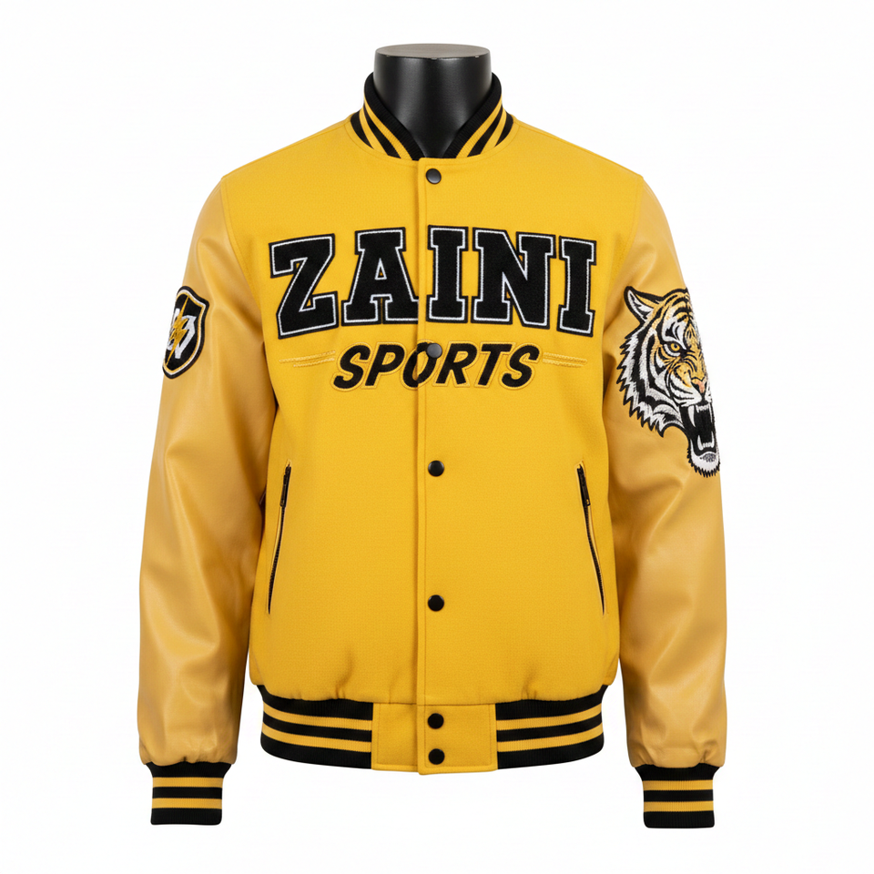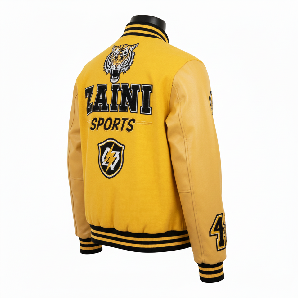 Men Varsity Jacket Premium Wool Body 330 GSM PU Leather Sleeves Yellow Black Striped Rib Embroidery Patches Varsity Jacket