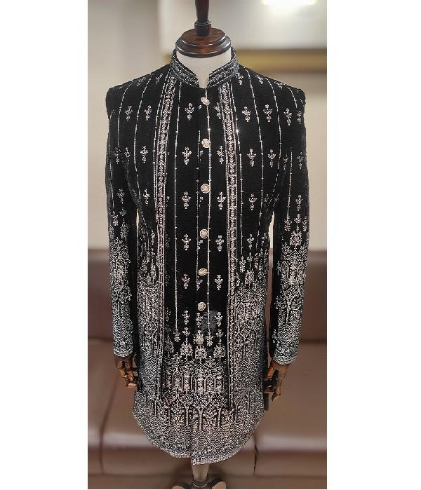 Men Velvet Indowestern Sherwani With Handcrafted Embroidery Open Style Jacket Matching Kurta Ideal For Formal Occasions Weddings