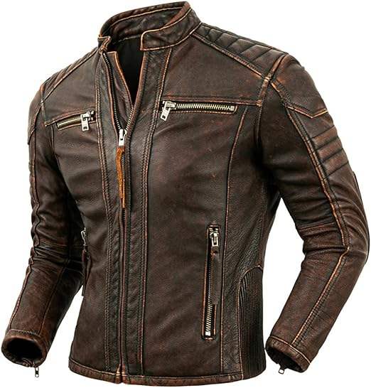 Men Vintage Genuine Sheep Leather Jacket Distressed Brown Slim Fit Biker Shoulders Crossover Casual Motorcycle Rider Waterproof