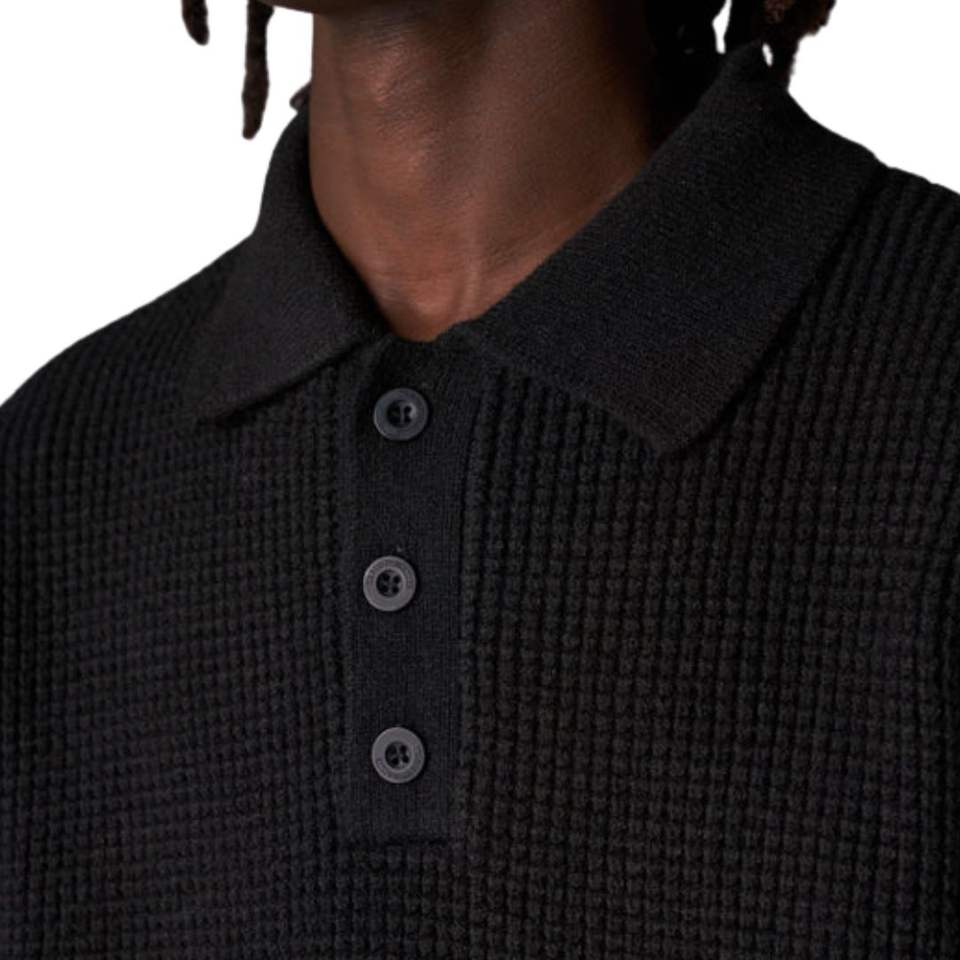 Men Waffle Knit Long Sleeve Polo Sweater Black Casual Button Collar Pullover Top Soft Textured Cotton Blend OEM Custom