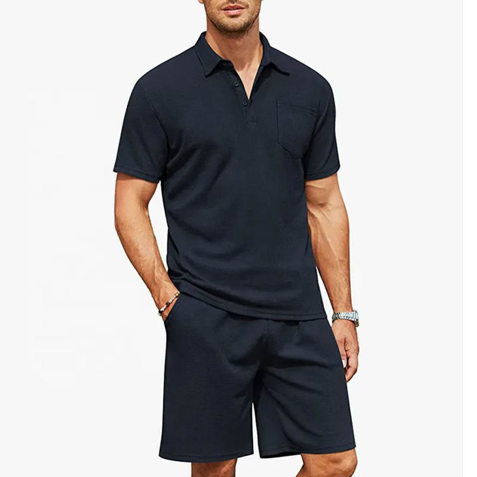 Men Waffle Knit Polo Shirt and Shorts Set 2 Pieces Outfits Summer Suit Casual Tracksuit with Pockets Breathable Plus Size Men's