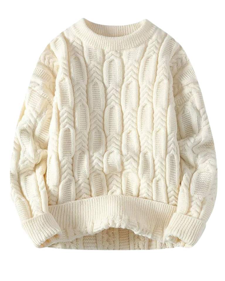 Men White Cable Knit Sweater Winter Warm Thick Crew Neck Pullover Soft Knitted Wool Style Casual Fashion Long Sleeve Jumper