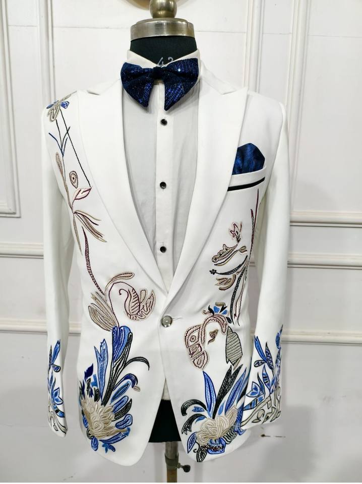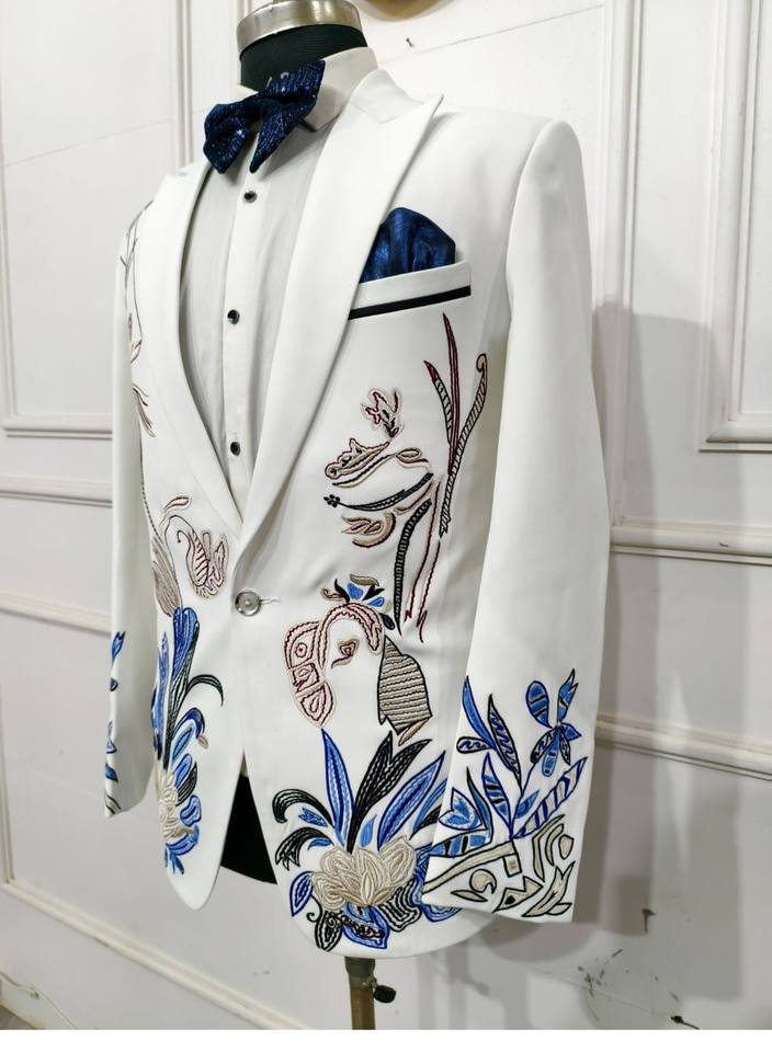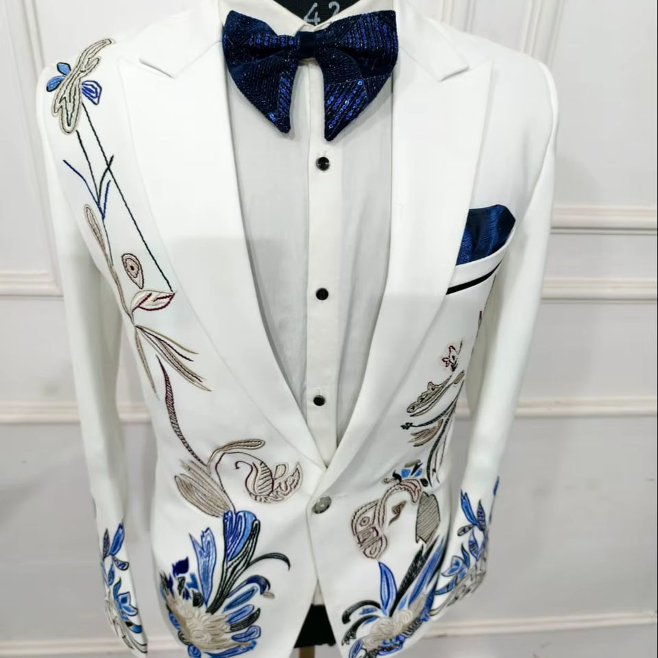 Men White Suit with Blue Embroidery Custom Wedding Party Tuxedo Designer 2 Piece Groom Suit