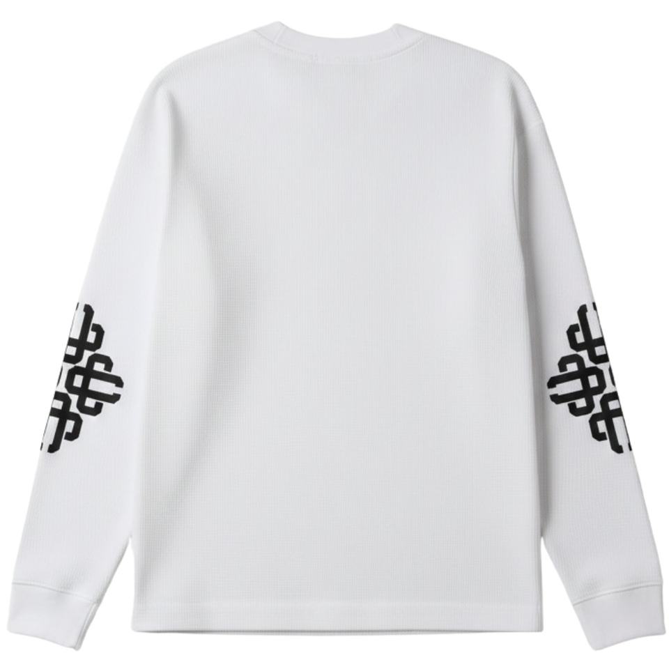 Men White Waffle Long Sleeve T Shirt with Emblem Print Crew Neck Cotton Casual Streetwear Fashion Top