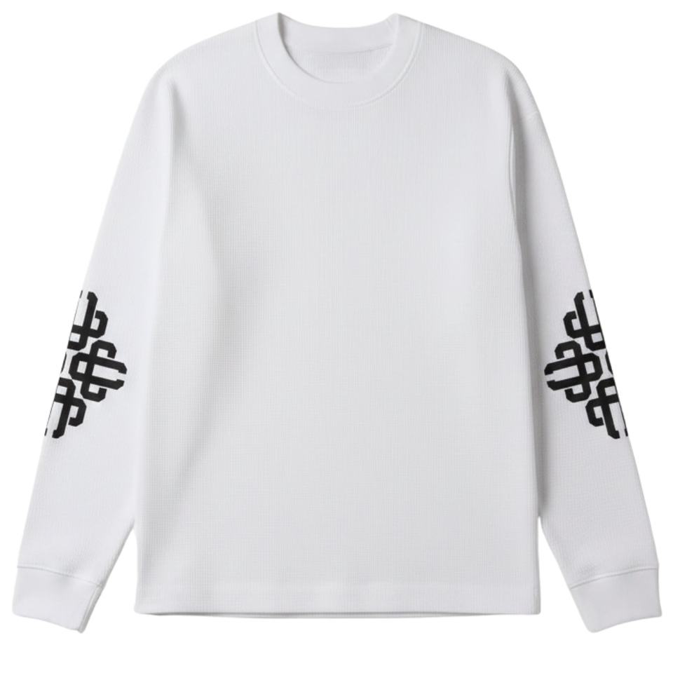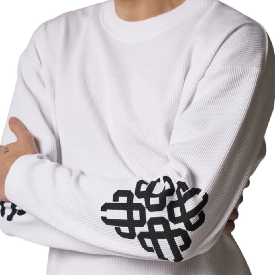 Men White Waffle Long Sleeve T Shirt with Emblem Print Crew Neck Cotton Casual Streetwear Fashion Top