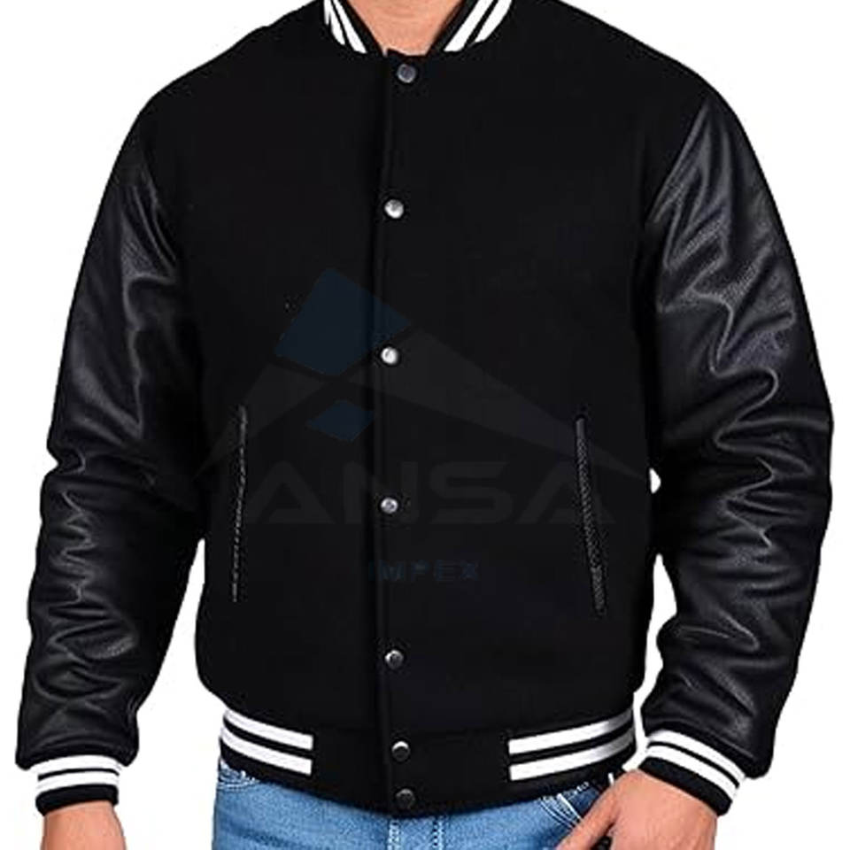 Men Wool-Blend and Genuine Leather Varsity Jacket Timeless Letterman Design Warm & Durable Construction Black White Lining