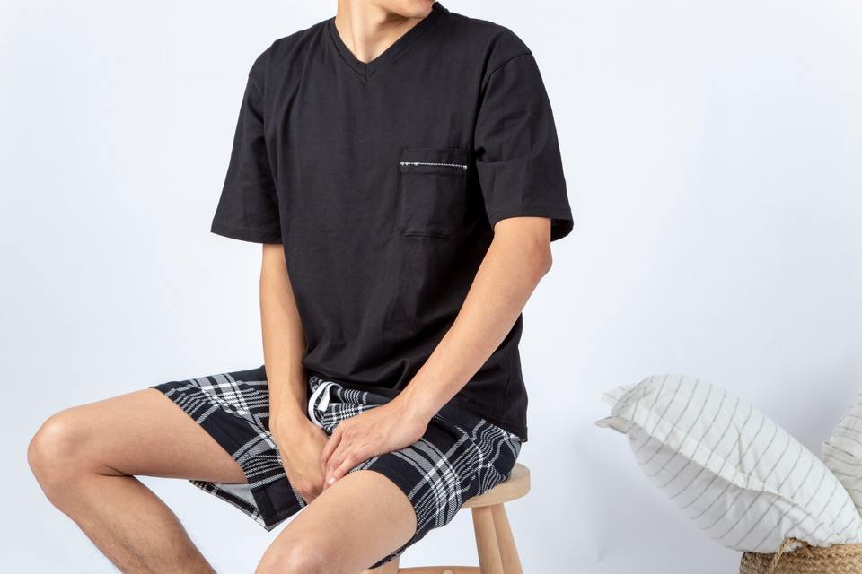 Men's 100% Cotton Knitted Two Piece Pajama Set V Neck Short