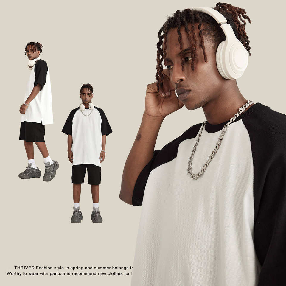 Men's 260GSM Heavyweight Cotton T-Shirt, Raglan Short Sleeve, Crew Neck, Summer Color Block Shoulder, Loose Fit