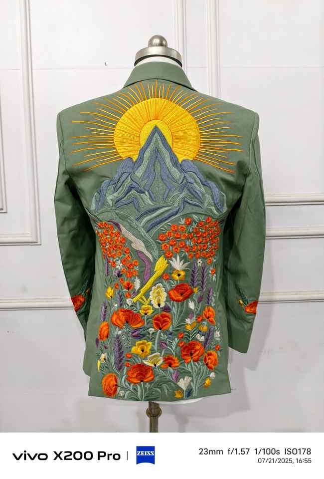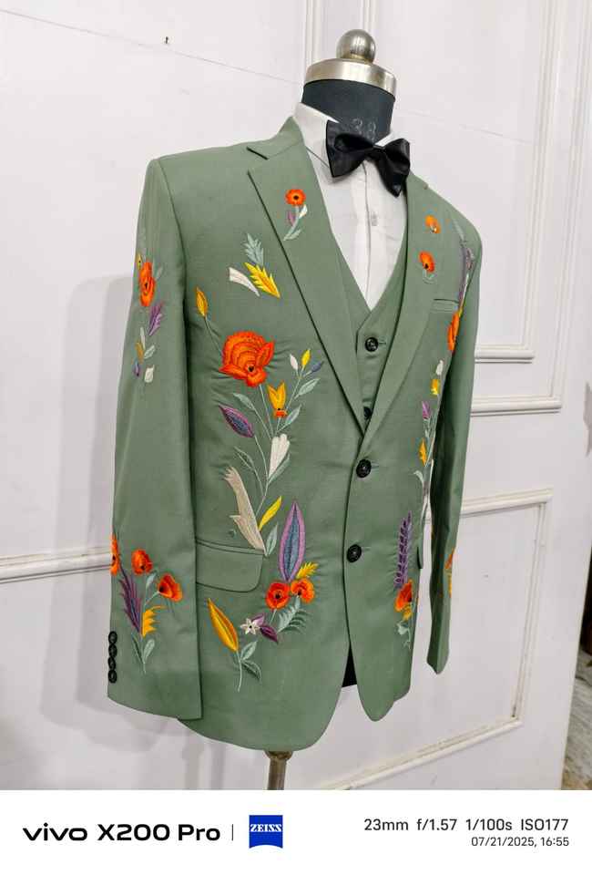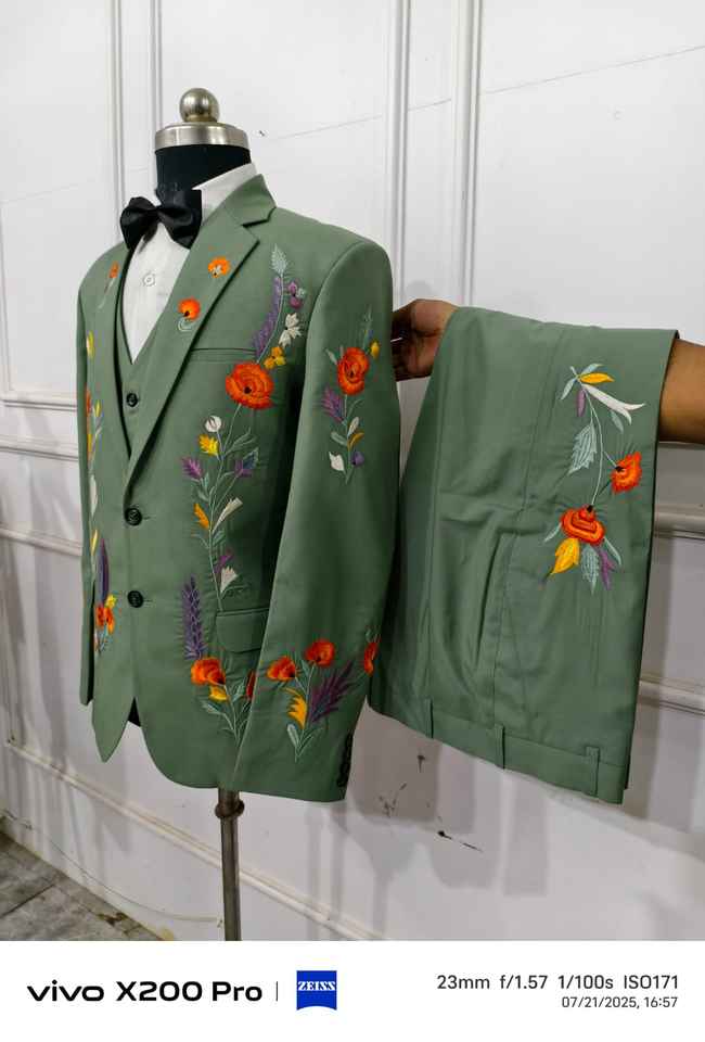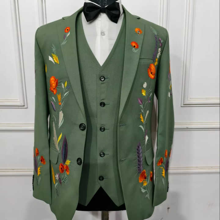 Men's 3 Piece Green Wedding Suit Custom Made Premium Cotton sunrise Embroidered Country Western Prom Party Cocktail Outfit
