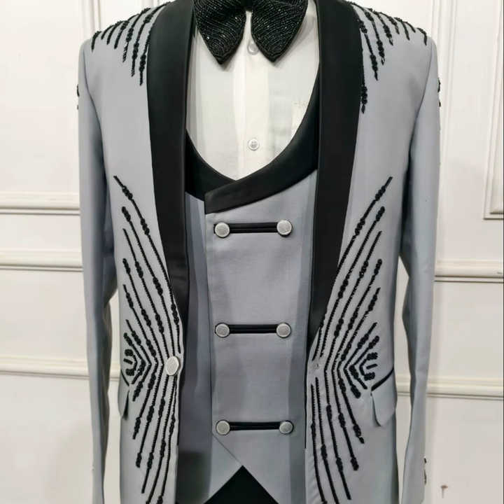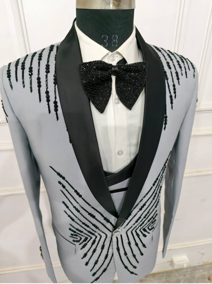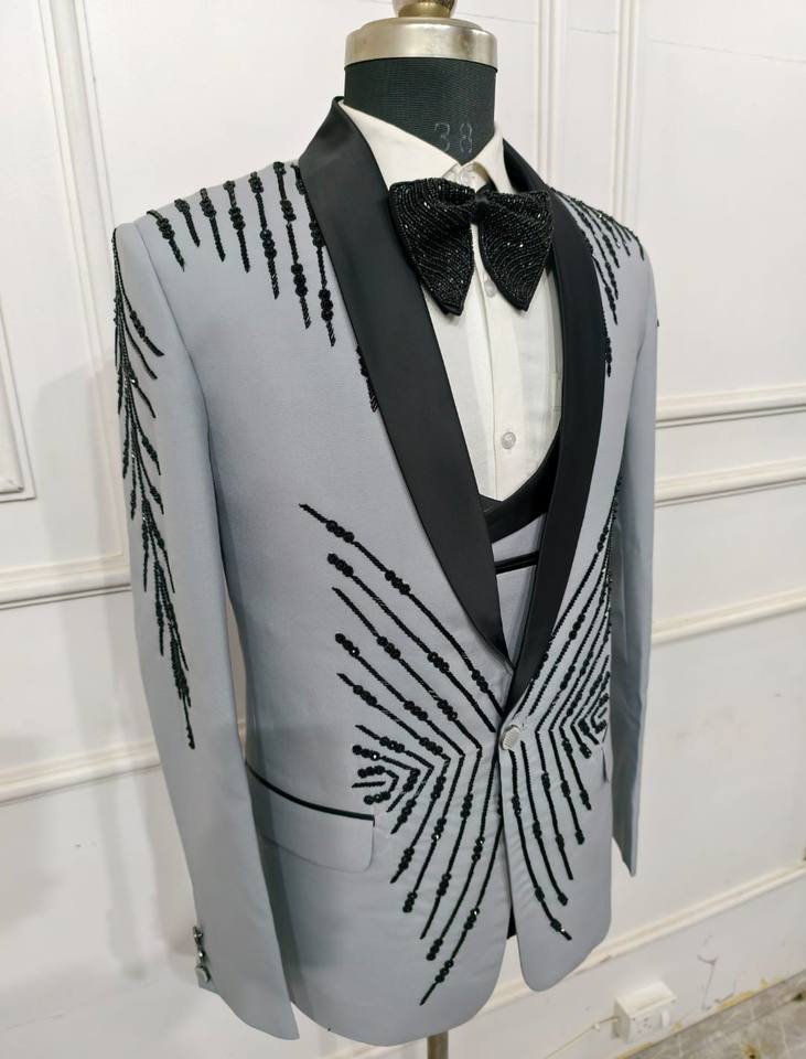 Men's 3 Piece Grey Wedding Suit Custom Made Premium Cotton Embroidered Country Western Prom Party Cocktail Outfit