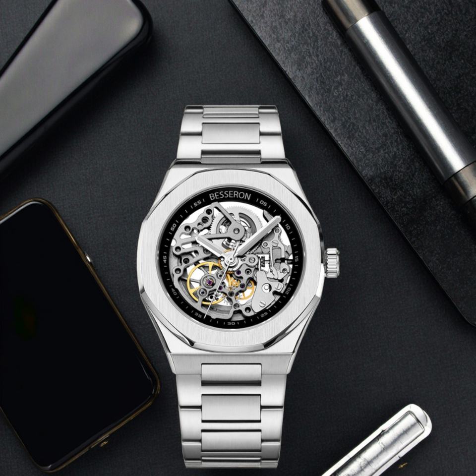 Men's 41mm Silver Black Stainless Steel Fashion Watch Skeleton Tourbillon Waterproof Automatic Luminous Mechanical Glass Pointer