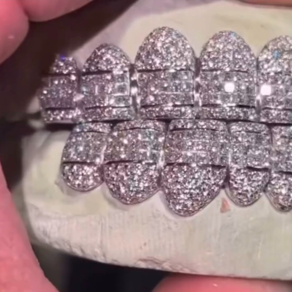 Men's 925 Silver Hip Hop Teeth Grillz Custom Iced Moissanite Diamond Teeth with White Gold Chain Best Price Jewelry