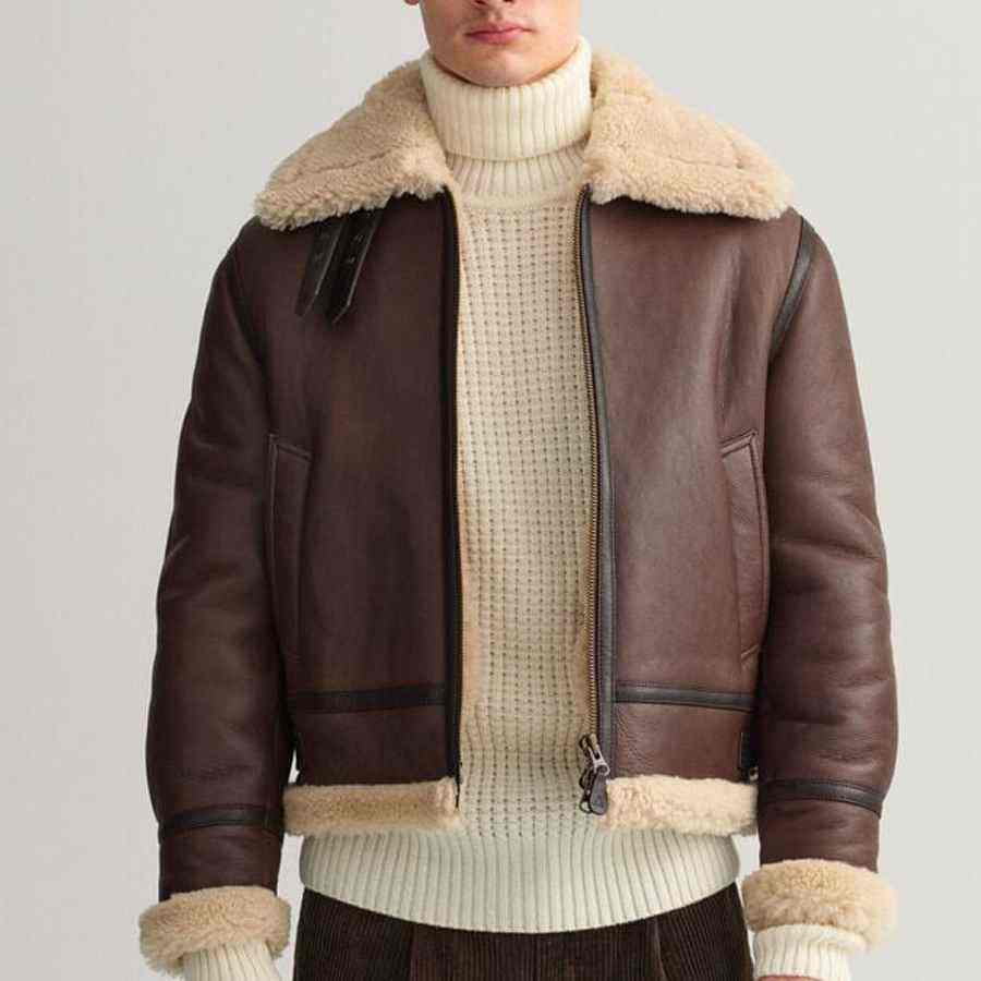 Men's B3 Sheepskin Shearling Leather Jacket Casual Flight Coat with Zippered Closure Genuine Leather Fur Bomber Jacket