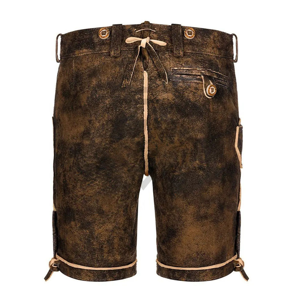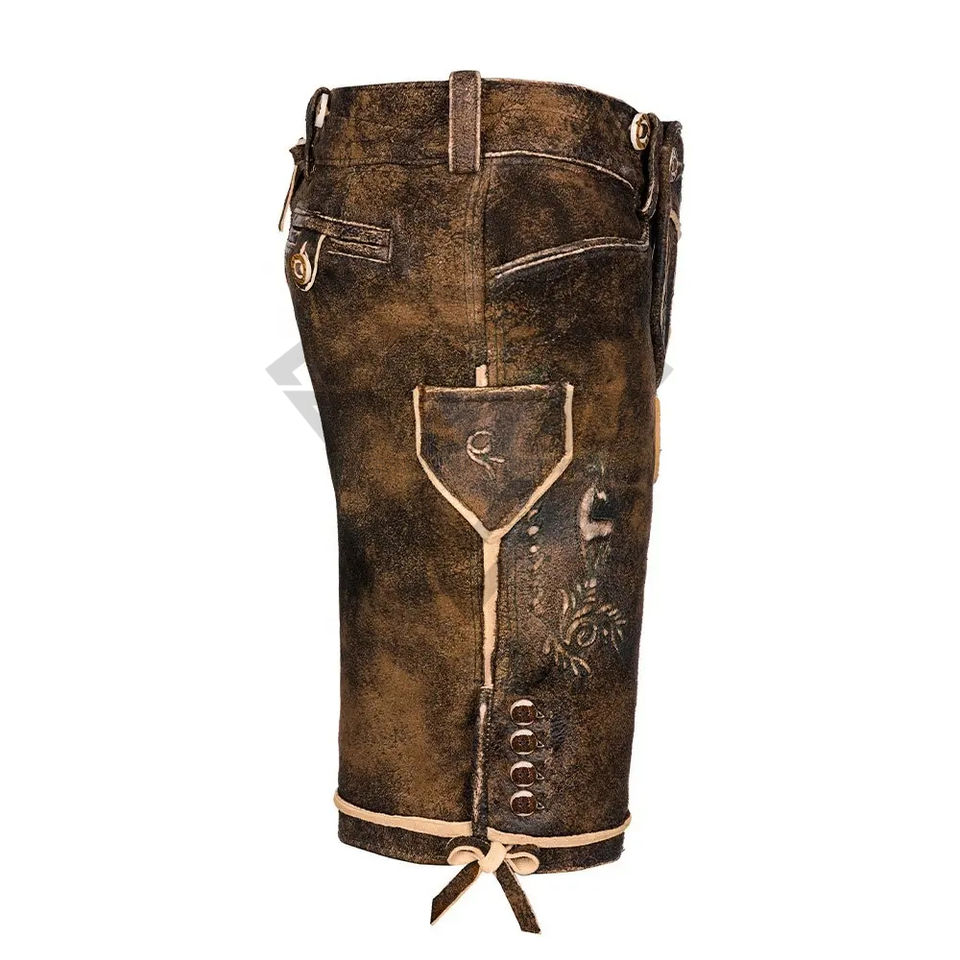 Men's Bavarian Oktoberfest Lederhosen 100% Genuine Swede Brown Leather Embroidered Shorts Fashionable Solid Canvas Trousers
