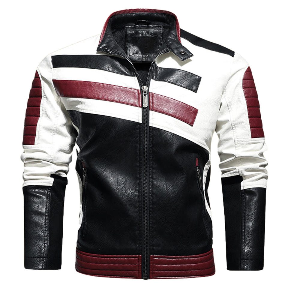 Men's Black Biker PU Cafe Racer Stand Collar Striped Black Red White Moto Rider Zip-Up Casual Slim Fit Faux Leather Jacket