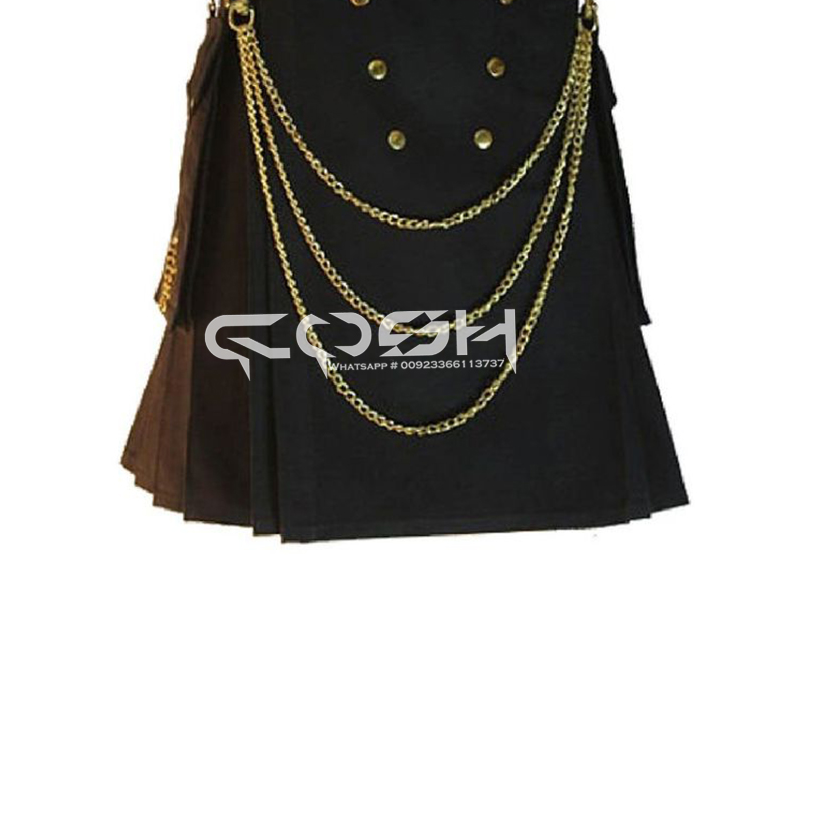 Men's Black Cotton Utility Gothic Kilt With Stylish Chains Durable Fabric and Adjustable Waist Straps
