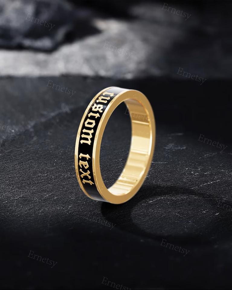 Men's Black & Gold Ring with Gothic Lettering, Modern Solid Gold Male Wedding Band, Custom Text Ring - e.g., Til Death