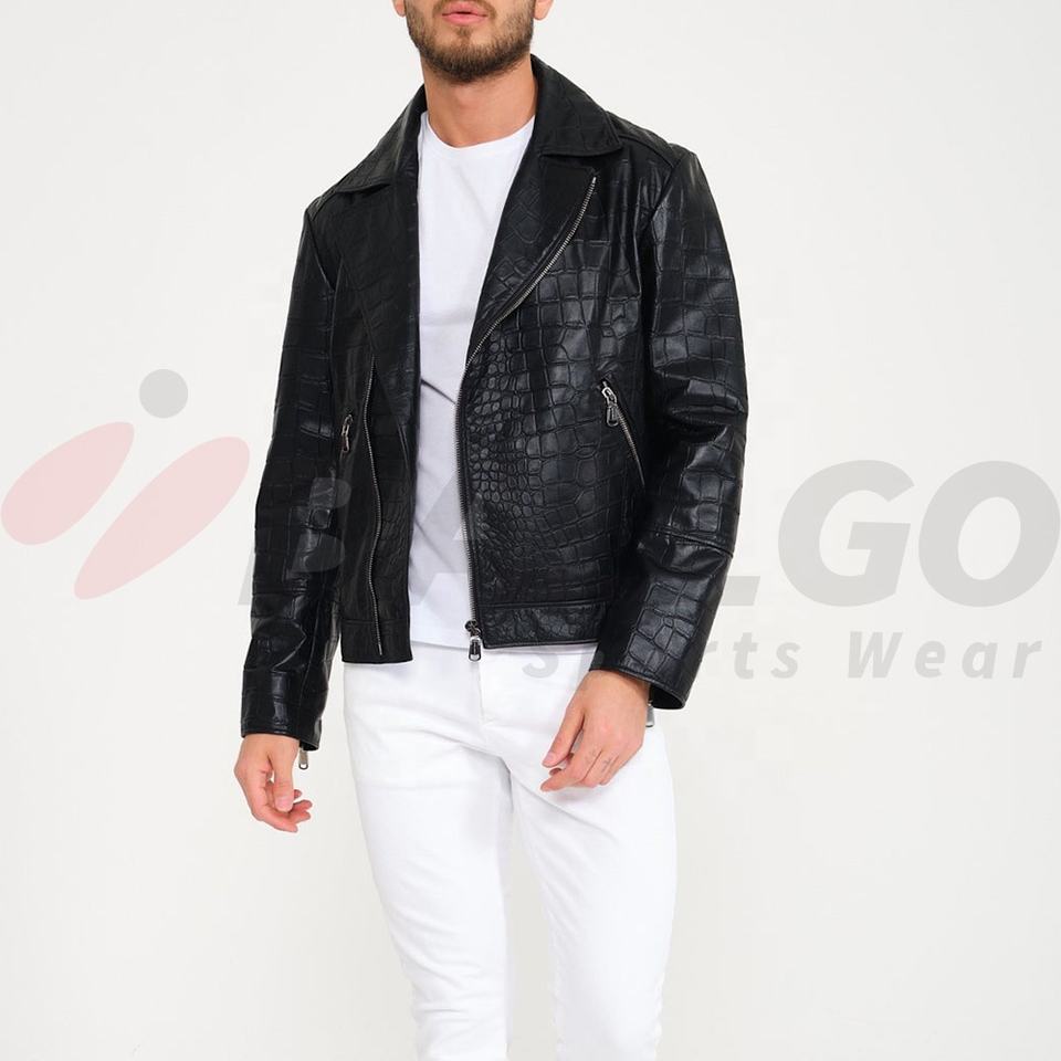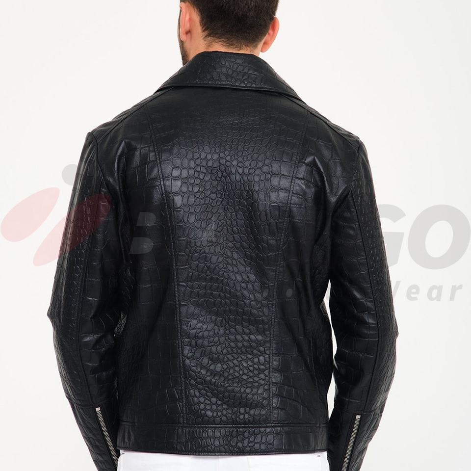 Men's Black Leather Biker Jacket With Crocodile Embossed Croc Print Jacket