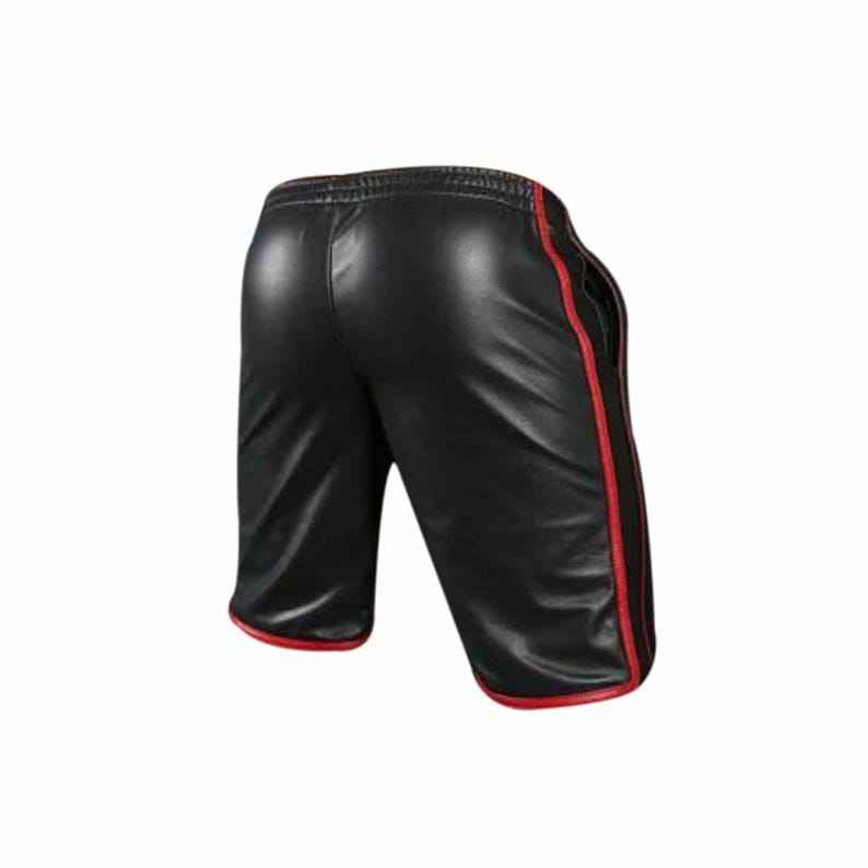 Men’s Black Leather Sports Shorts with Red Piping | Soft Lambskin Gym Shorts | Handmade Fetish Clubwear