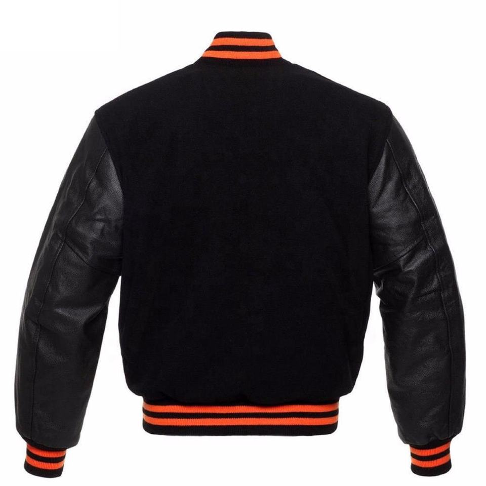 Men's Black Pure Wool Varsity Letterman Bomber Jacket with Genuine Leather Sleeves Outdoor Style