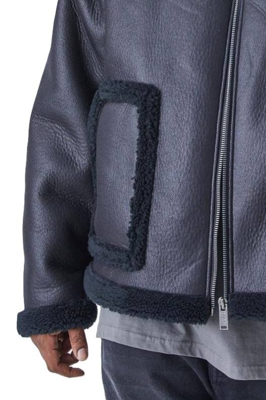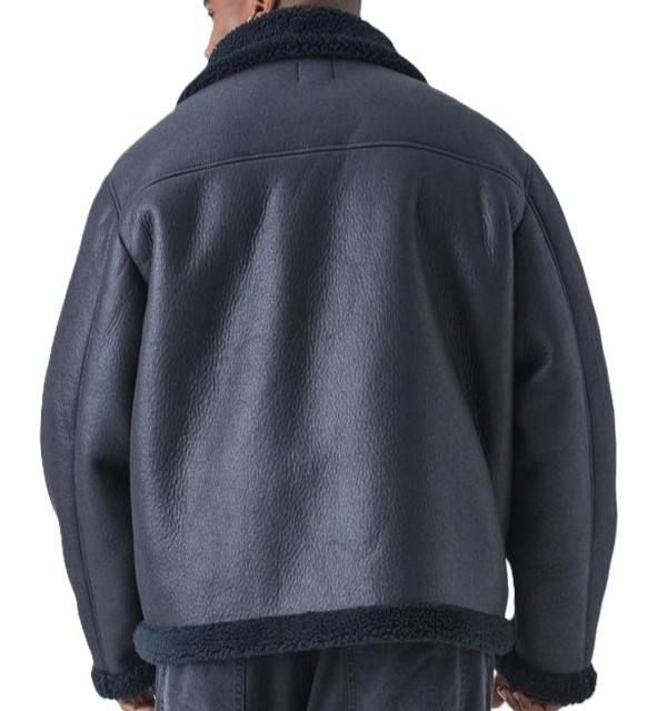 Men's Black Shearling Leather Jacket Winter Aviator Bomber with Fur Collar Buckle Straps and Warm Fleece Lining