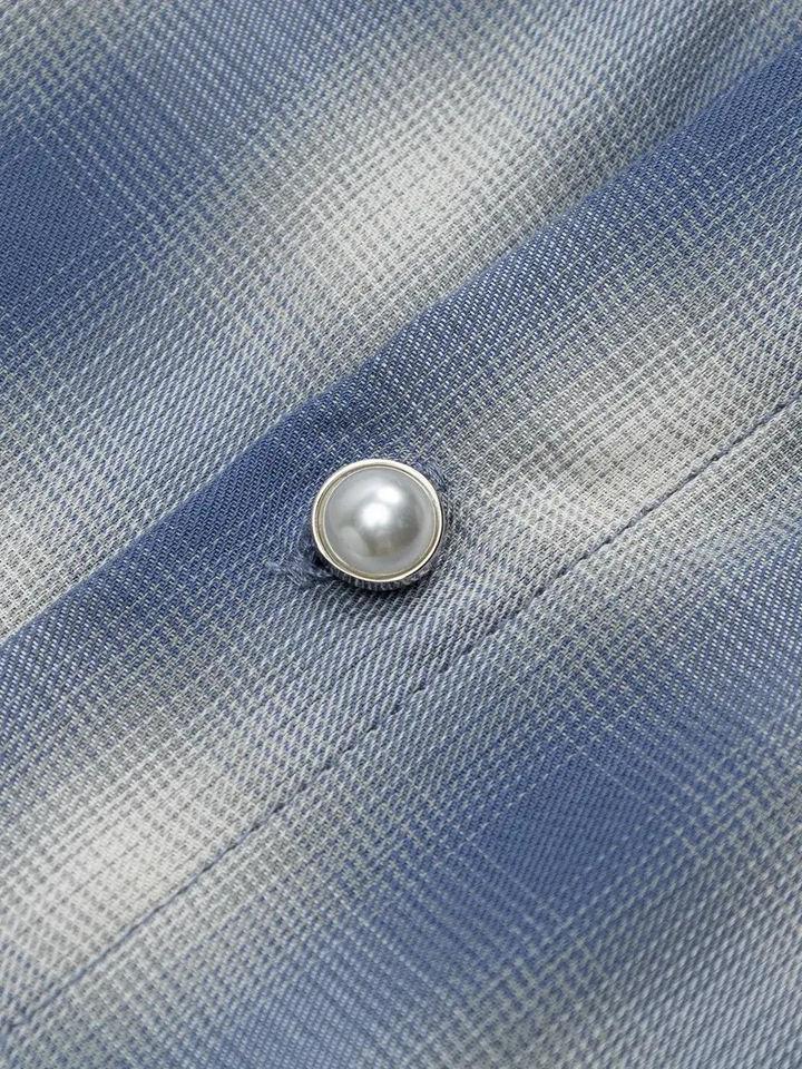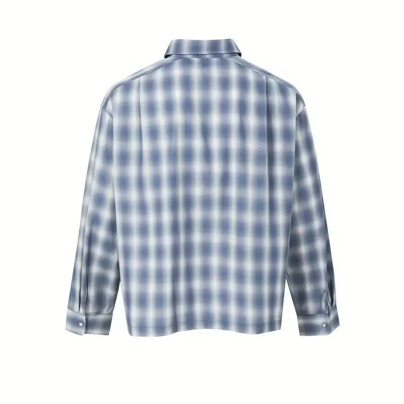 Men's Blue Plaid Long Sleeve Shirt Classic Gingham Check Pattern (White/Gray/Blue) Relaxed Fit Button- Collar Neckline & Durable