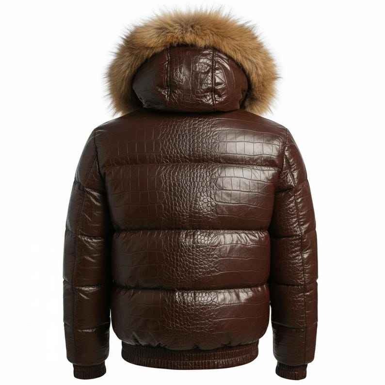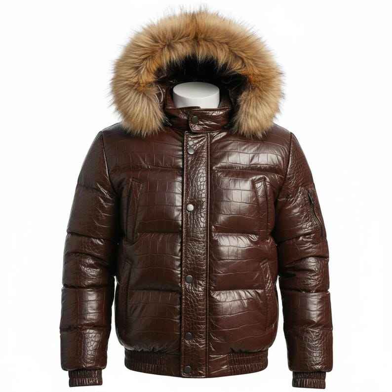Men’s Brown Leather Puffer Jacket with Fur Hood | Genuine Leather Winter Bomber